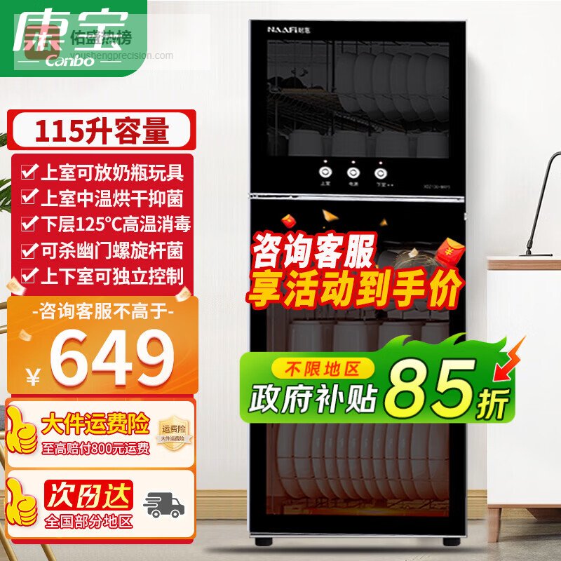 康宝(Canbo)消毒柜家用 立式小型 二星级高温消毒碗柜 厨房客厅碗筷柜 不锈钢内胆箱体 中温烘干奶瓶玩具 黑色 二星级 115L 丨高温消毒+康宝耐惠¥
