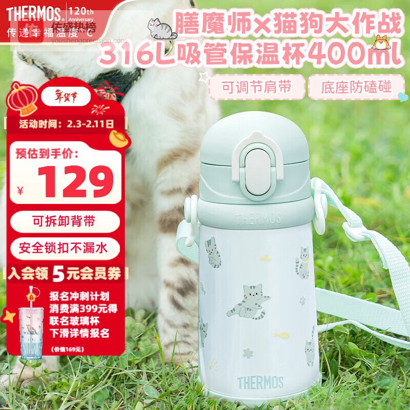 膳魔师(THERMOS)儿童保温杯大容量水杯316l不锈钢杯学生吸管杯运动水壶喝水杯子 薄荷绿吸管杯 400ml (2套吸管)¥