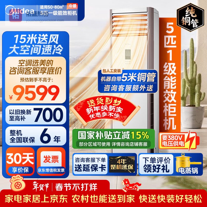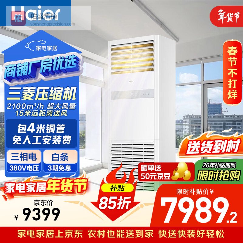 这款5匹380V商用柜机专为工业级用电环境打造,支持宽电压运行342V–418V ,抗电网波动能力强。核心搭载一键PMV舒适设定功能,能根据人体热舒适模型自动匹配温湿度组合,省去反复调试烦恼。双PID精准控温技术确保出风凉而不冷、暖而不燥,长时间运行体感更自然。它采用背景海景配色设计,视觉清爽不突兀,融入现代办公或零售空间毫无压力。内部配置全升级部件,包括高精度传感器与强化铜管路,故障率低且维护周期长。特别适合对稳定性要求高的银行网点、连锁药店或小型数据中心机房。
