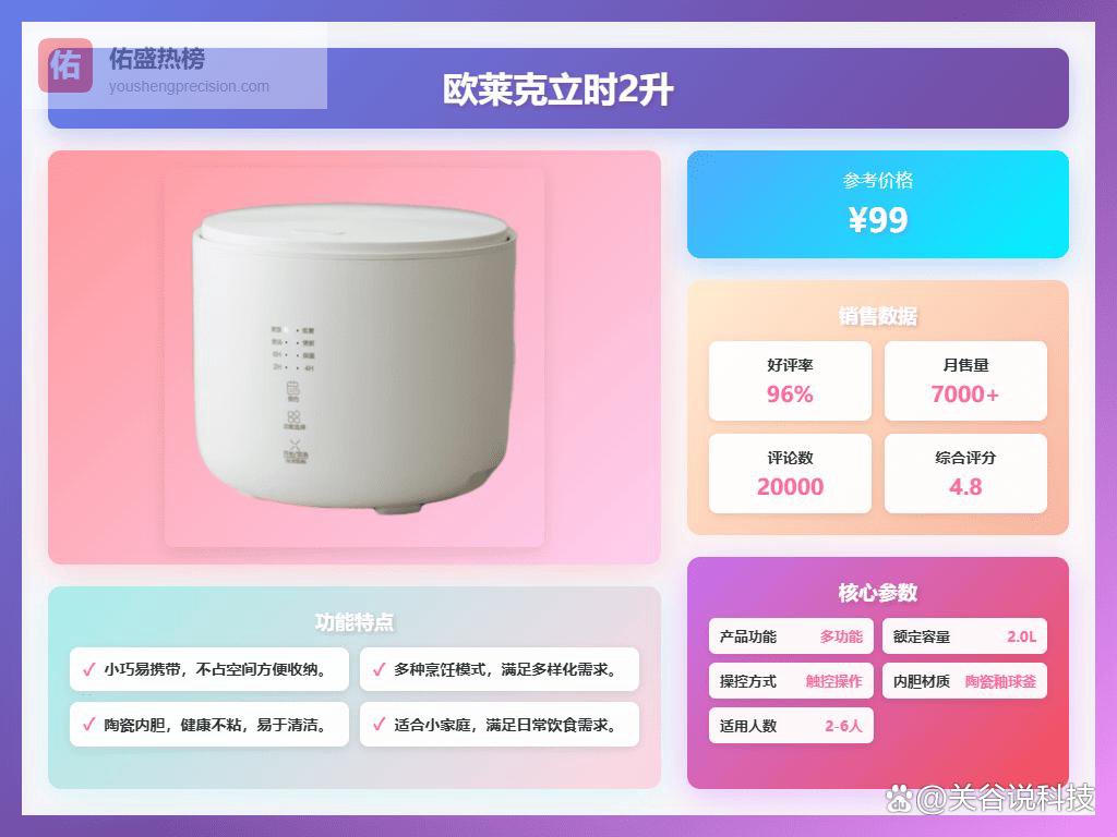 九、欧莱克▶ 多功能烹饪:这款欧莱克电饭煲不仅能煮米饭,还能做粥、汤、炖肉,满足你各种日常烹饪需求。一锅多用,花样挺多,操作起来也很方便,让你省心又实用。