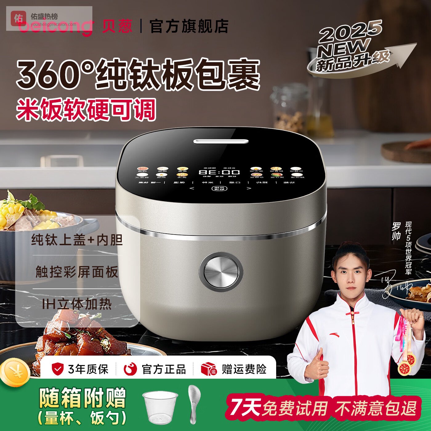贝葱360度纯钛板电饭煲0涂层不粘锅内胆多功能IH加热米汤分离低糖电饭锅家用4升5-9人 【25年升级款】钛上盖+钛内胆|香槟金 4L¥