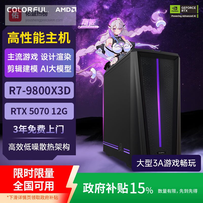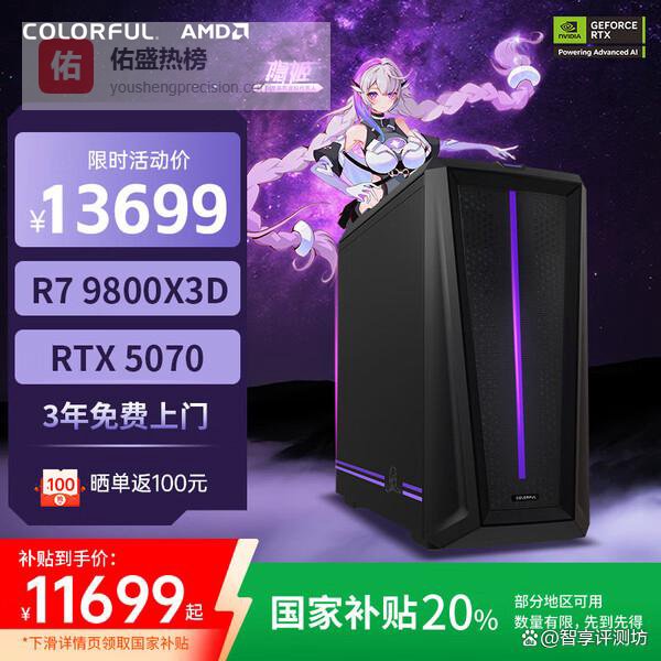 七彩虹(Colorful)隐星T5电竞游戏台式机AMD高性能电脑整机5070主机国家补贴【R7 9800X3D丨RTX5070丨32G D5丨1T】¥