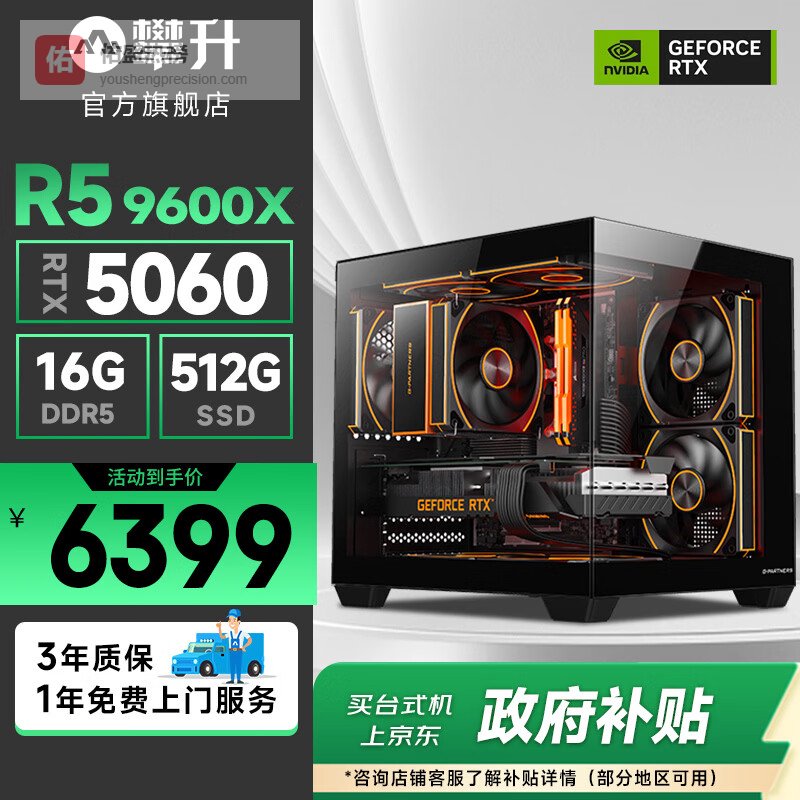 攀升AMD锐龙R5 9600X/R7 9700X/7800X3D/9800X3D/5060Ti/5070设计渲染电竞游戏台式电脑主机台式机整机 配置五 R5 9600X RTX5060¥