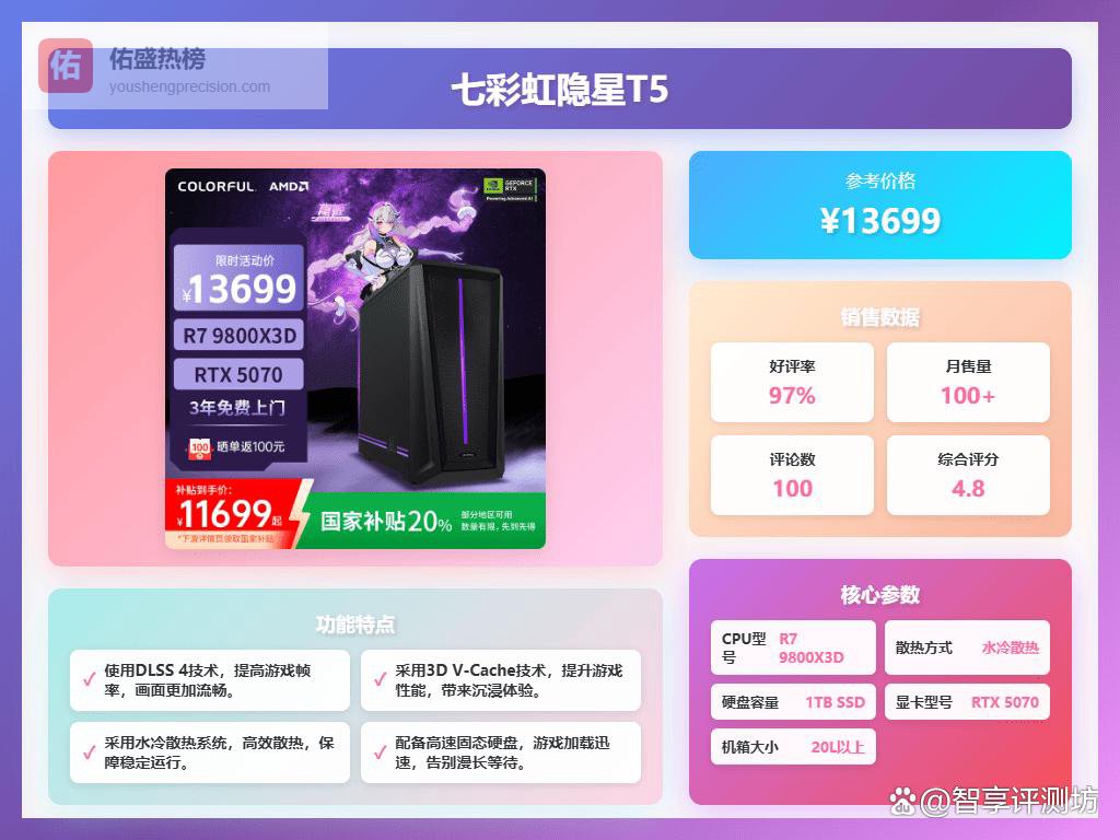三、七彩虹这款七彩虹隐星T5配备了AMD Ryzen 7 9800X3D处理器,拥有八核十六线程,最高频率可达4.7GHz,性能表现倒是挺不错的。配合AMD的3D V-Cache技术,能在游戏和多任务处理时带来更流畅的体验,尤其适合喜欢沉浸式游戏的用户。整体架构采用TSMC 4nm工艺,保证了处理器的效率和稳定性。
