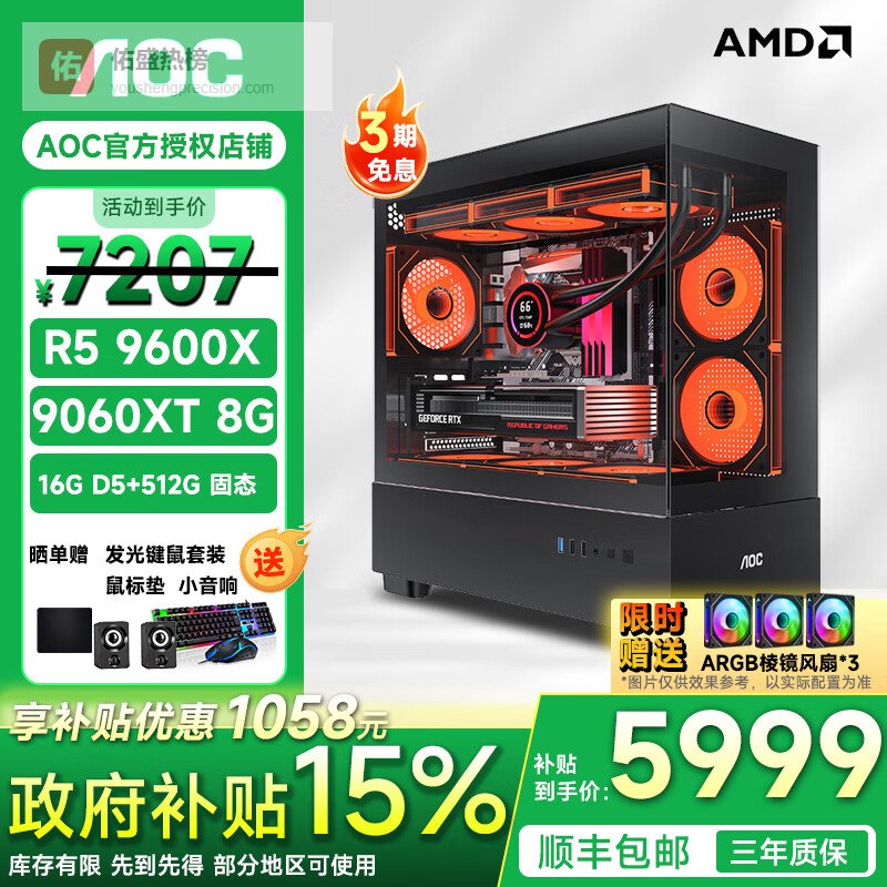 AOC AMD锐龙R5 9600X/5060/Ti/5070主机 组装台式电脑直播三角洲游戏电竞设计渲染剪辑DIY电脑套机 配二:9600X丨9060XT丨16G+512G 单主机¥