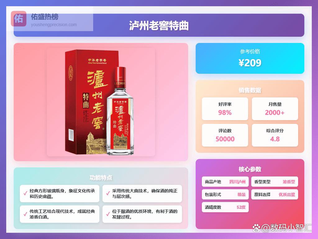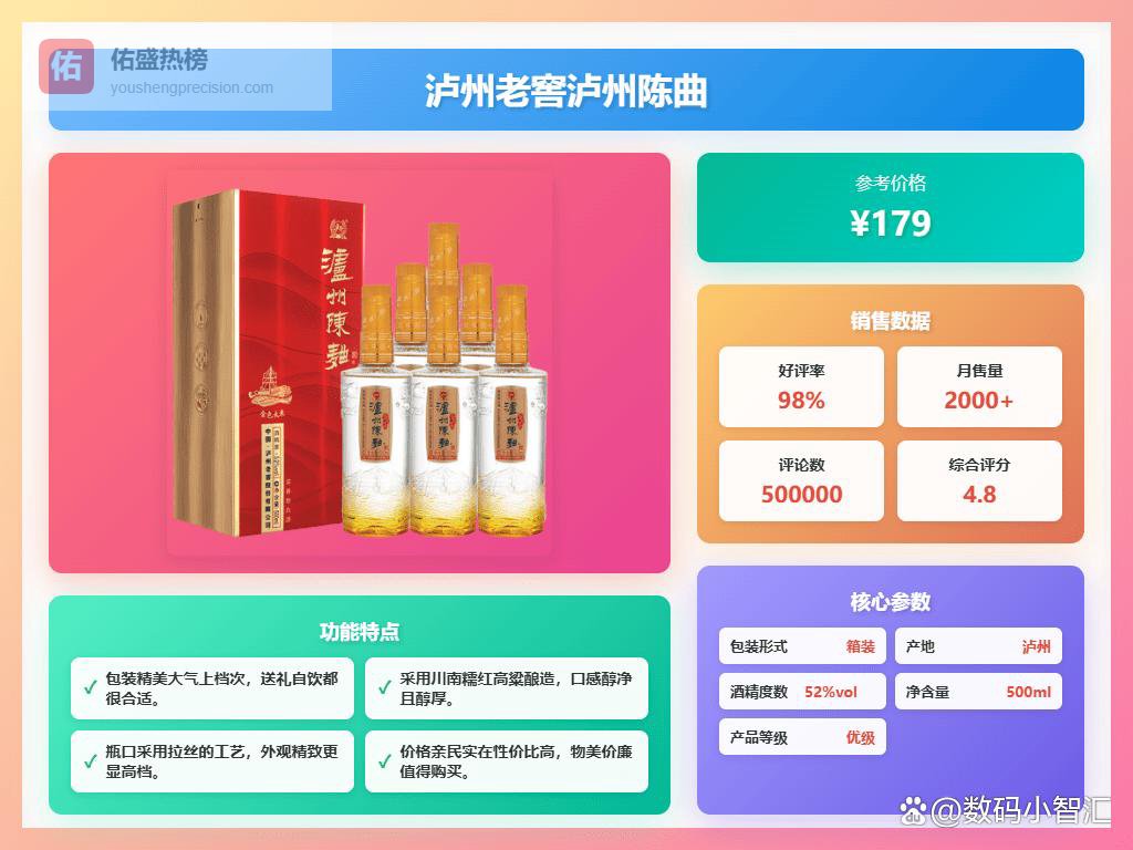 ③ 经典工艺:采用固态法酿制,传承泸州老窖的传统技艺,瓶身还用晶莹剔透的玻璃和拉丝工艺打造,外观大气,握在手里也挺有质感。这样的工艺,让酒更具品质感和收藏价值。