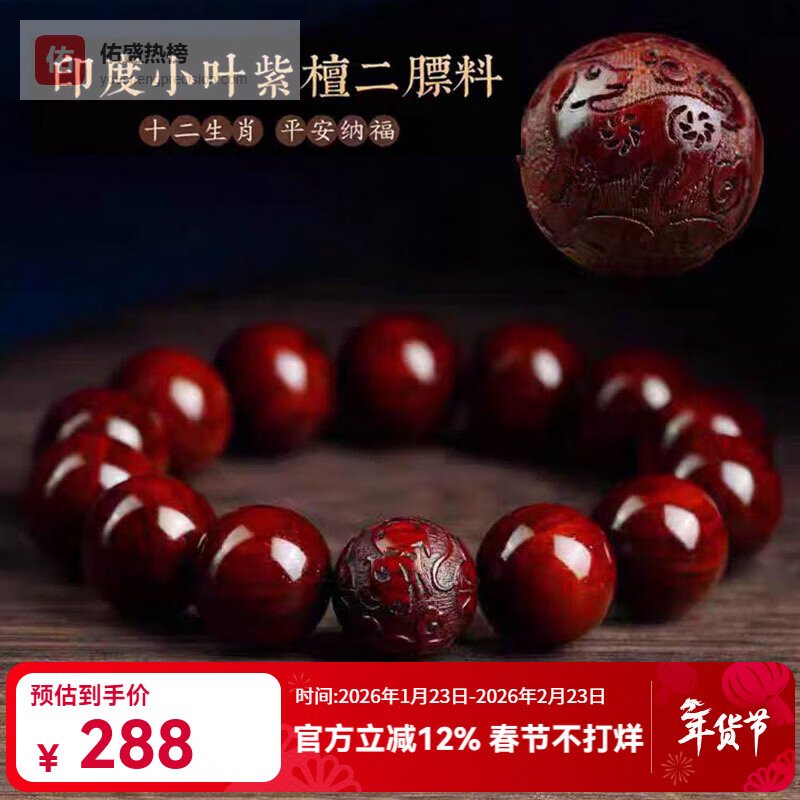 推荐理由:正宗印度小叶紫檀、独特十二生肖设计、适合马年佩戴、18mm珠径
