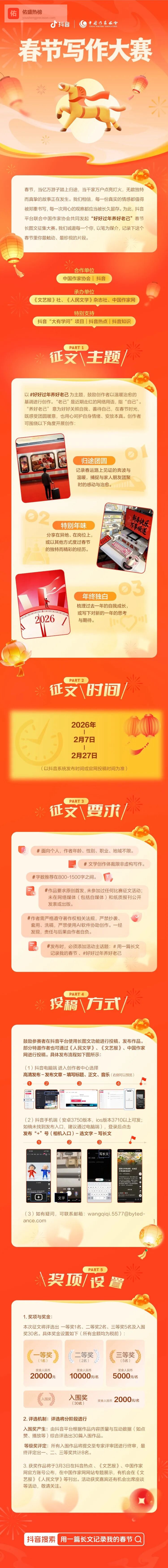 本次大赛征稿时间为2026年2月7日至27日,面向全社会个人开放,无年龄、职业、地域限制。大赛要求作品为原创首发的非虚构写作,字数800-1500字,发布时需添加#用一篇长文记录我的春节 #好好过年养好老己 两大话题词。参赛者可通过抖音电脑端或手机端的长图文功能投稿,特邀作者可通过《文艺报》《人民文学》和中国作家网进行投稿。