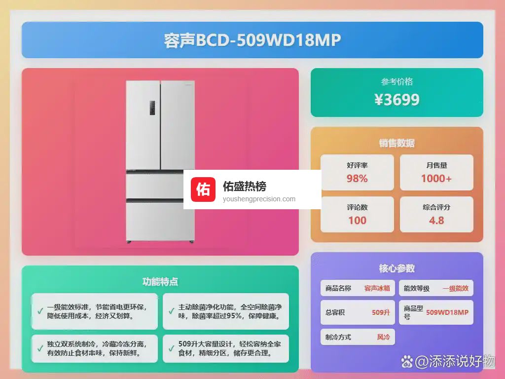 四、容声这款容声BCD-509WD18MP拥有509升的大容量空间,倒是挺适合大家庭使用,可以存很多食材。它的多门设计让你可以根据不同食材需求进行分类存放,保持整洁,也方便取用。内部结构还算合理,空间布局上还行,放东西还算顺手。
