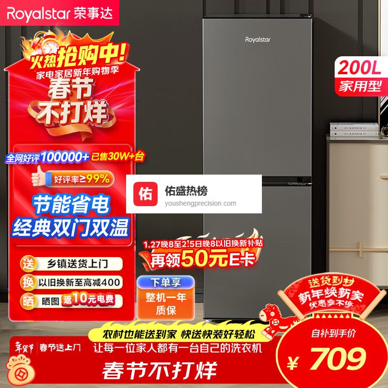 九、荣事达这款荣事达R200冰箱采用直冷制冷方式,能在较低能耗下保持食材的新鲜。容量为200升,分为冷藏和冷冻两个区域,还配有一个15升的微冷冻室,适合家庭日常储存多样食材。机械控温操作简单,温度调节范围广泛,能满足不同食材的保存需求。