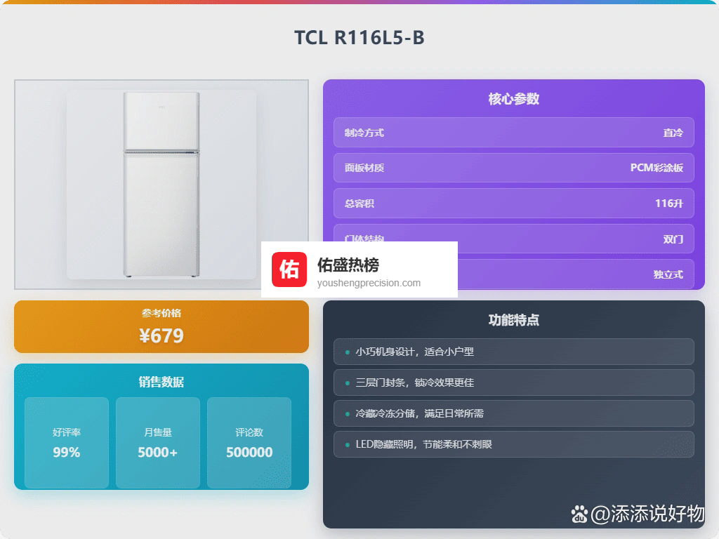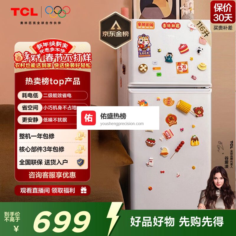二、TCL这款TCL R116L5-B冰箱配备116升的总容积,其中包括85升的冷藏室和31升的冷冻空间,基本满足家庭日常储存需求。采用的3D环绕立体制冷技术能让冷气均匀流通,有效保持食材的新鲜和口感。而高品质的压缩机不仅提供稳定的制冷效果,还能帮助节省电力,整体能耗表现不错,日耗电量大约0.43度,符合二级能效标准。