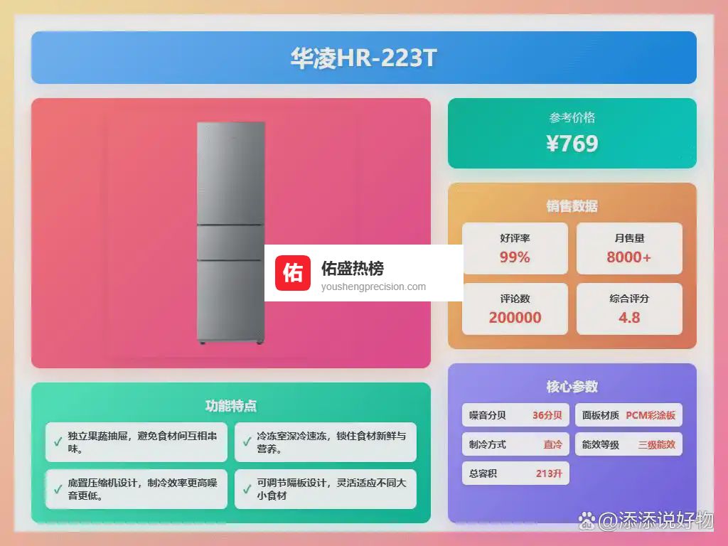 2026年节能冰箱哪个牌子好,口碑好的品牌推荐一、华凌这款华凌HR-223T冰箱采用三门三温区设计,可以实现不同区域的独立储存,像水果、肉类和冷藏品都能分开存放,食材的新鲜度更有保证。电子控温系统让温度调节变得更精准,也更省能,试了几次都挺简单。低噪音水平在36分贝左右,使用时几乎感觉不到声音,挺适合家庭安静环境。