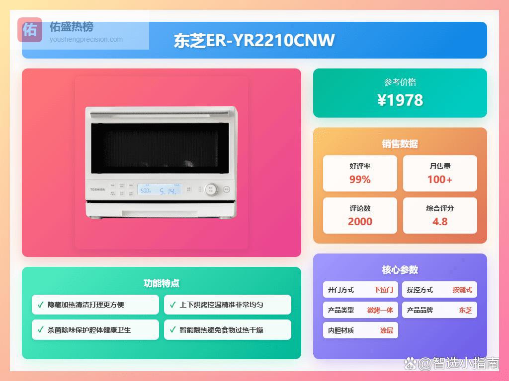 三、东芝多功能烹饪:这款微波炉不只是做做微波加热,还能烤、蒸、解冻、消毒什么的,一台搞定多种烹饪需求。无论是热饭、烤披萨还是蒸包子,都能轻松应对,特别适合厨房空间有限的家庭。