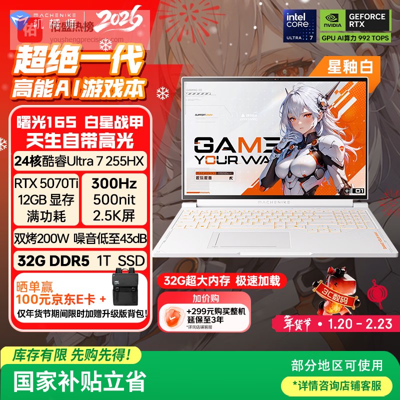 【京东自营】机械师曙光16SUltra星釉白【300Hz屏】16英寸AI游戏本笔记本电脑国家补贴¥