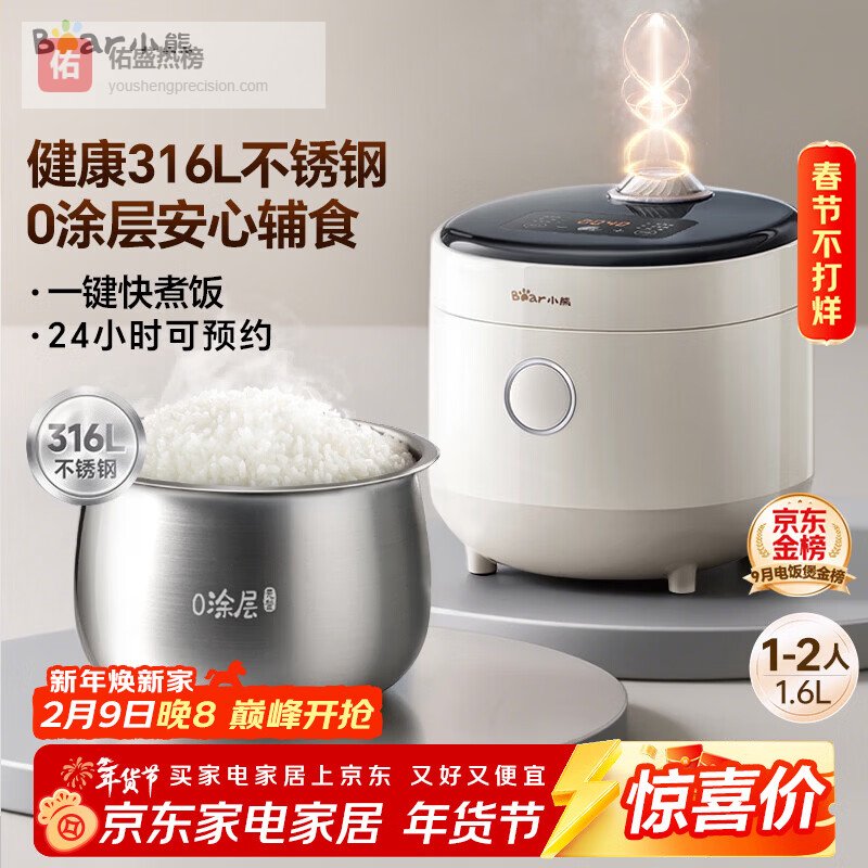 小熊(Bear)电饭煲1-2人用 小电饭锅 0涂层健康316L不锈钢一键快煮饭微压多功能可预约1.6LDFB-C16M3¥
