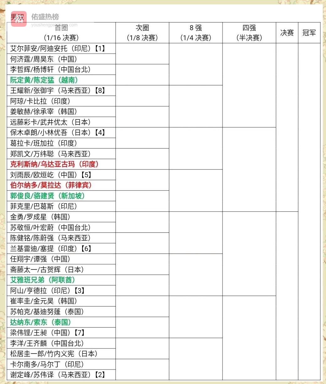 男双:中国台北组合卢敬尧/杨博涵、泰国强档南达卡恩/查伦蓬集体休战;