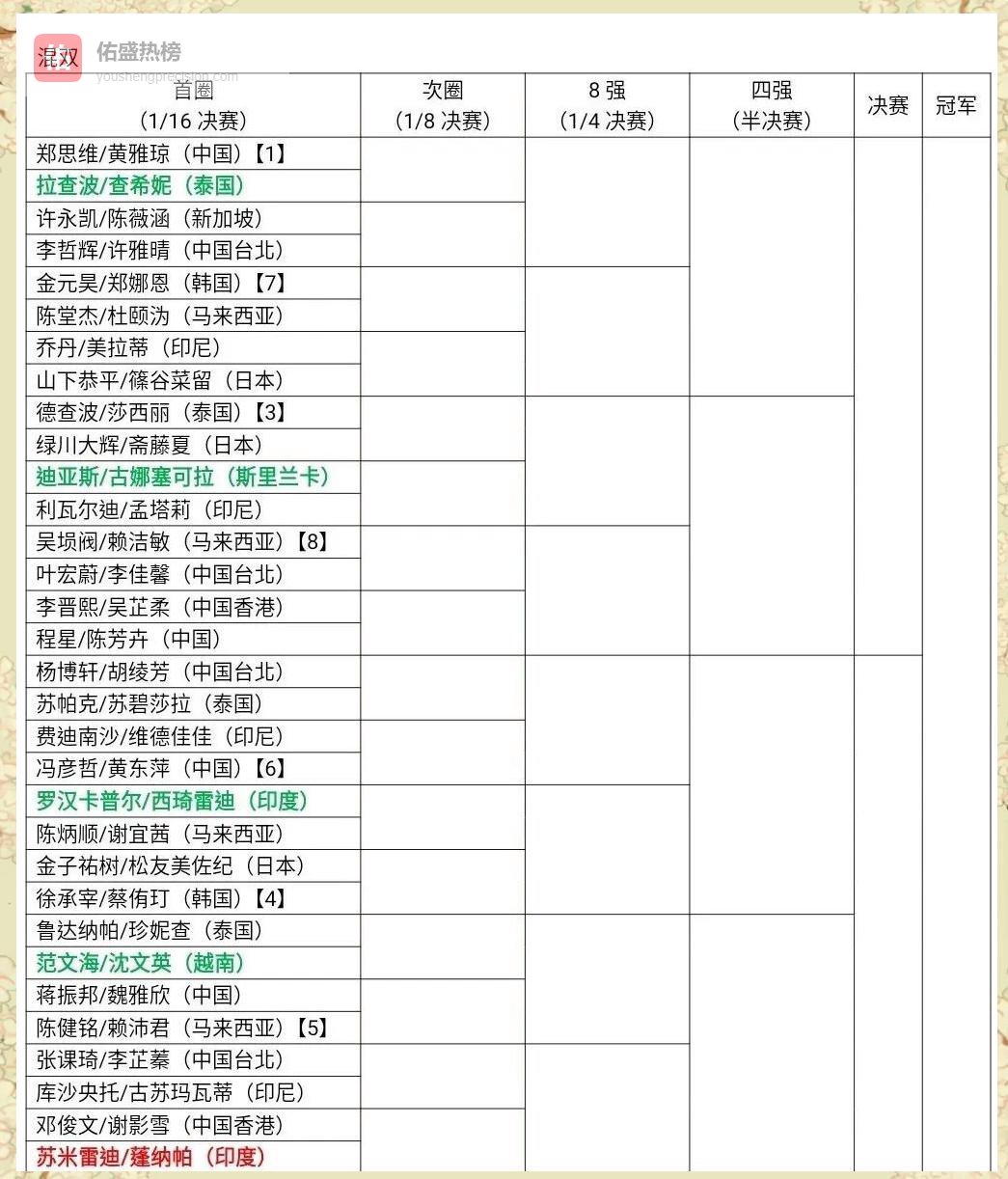 混双:郑思维/黄雅琼、冯彦哲/黄东萍、蒋振邦/魏雅欣、程星/程芳卉—— 雅思组合与“黄鸭”二线并进。