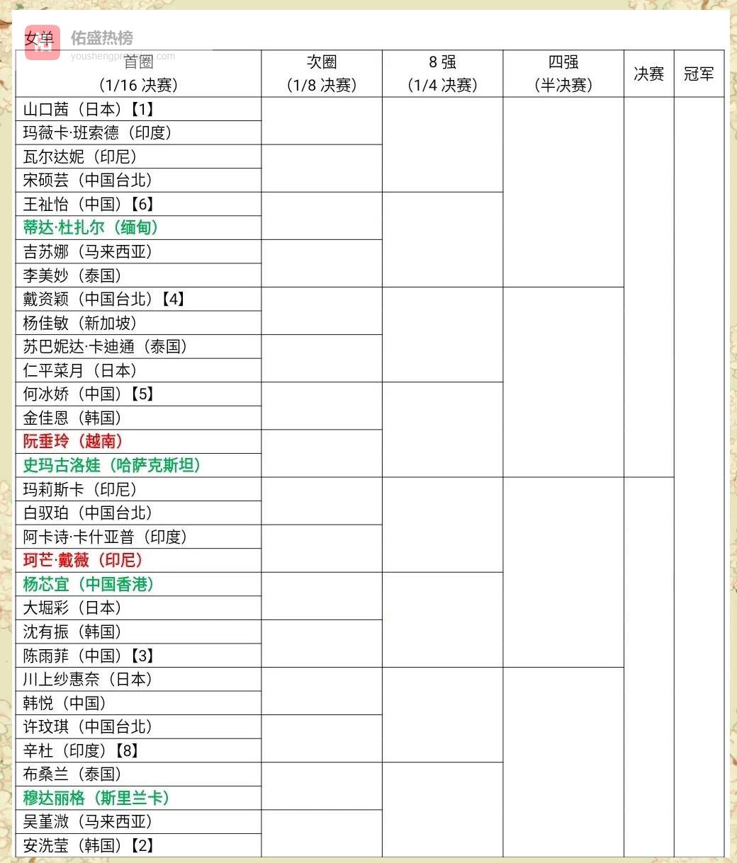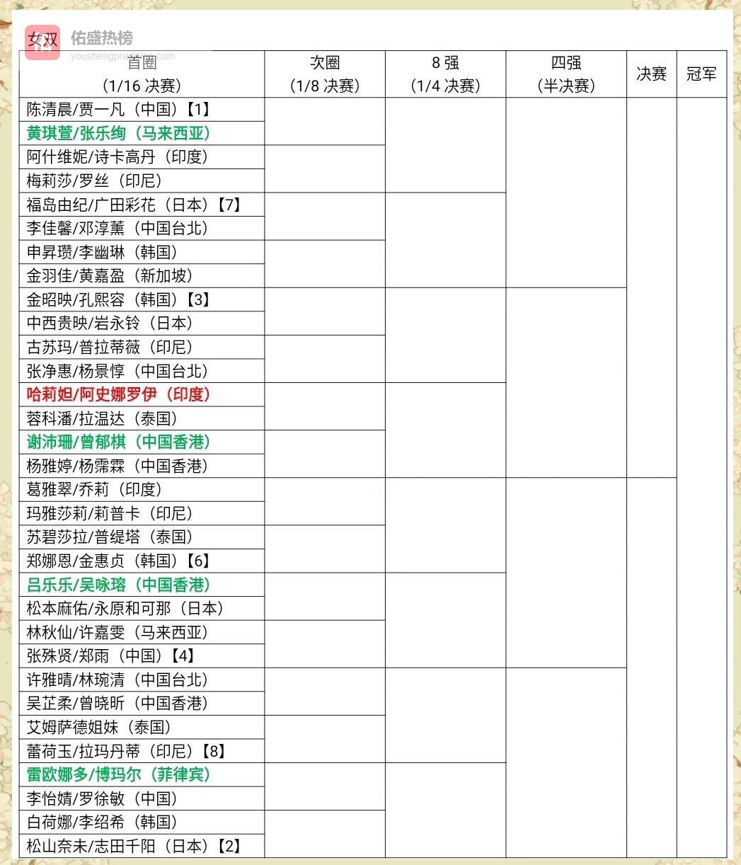 由于退赛较多,组委会决定在 资格赛全部结束后再公布完整签表,给补位选手争取更多调整时间。绿字代表“资格赛晋级”,红字代表“退赛补位”,球迷需等待官方最终确认。