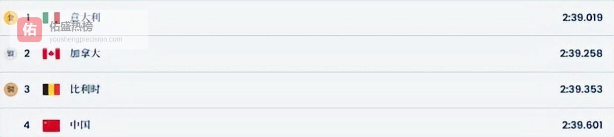金牌被意大利队拿下了,他们以2分39秒019的成绩在家门口夺冠,加拿大队获得银牌,比利时队则摘得铜牌。