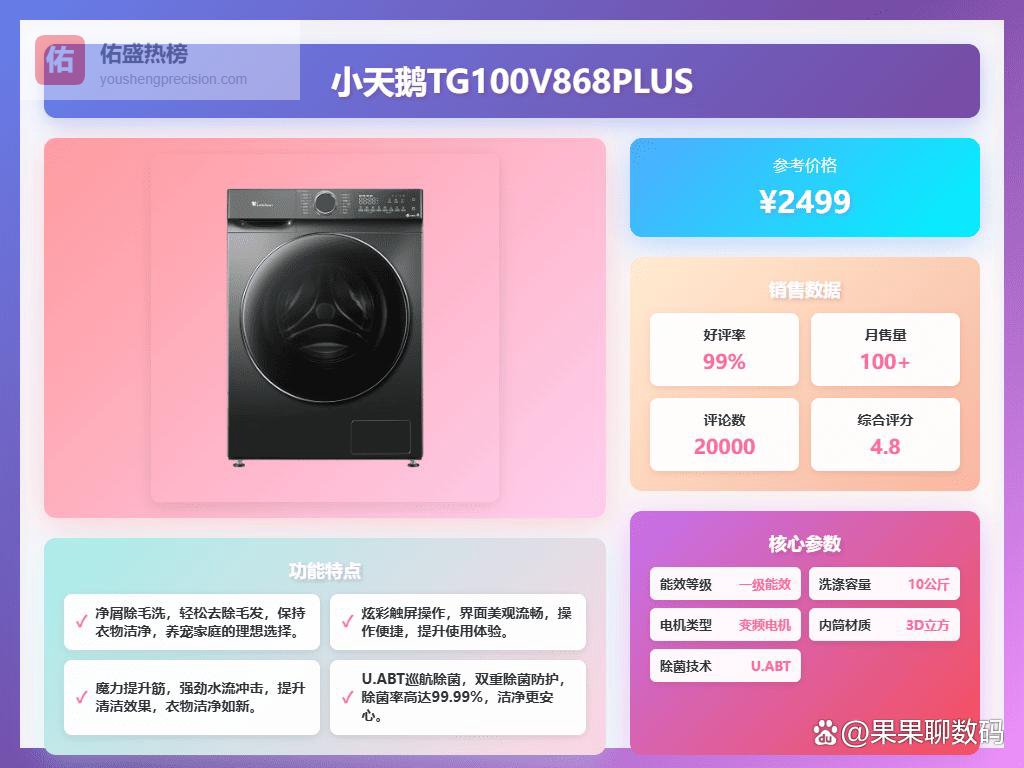 要说小天鹅变频洗衣机怎么选,我觉得首先得看你家的人口和洗衣习惯。如果家里人多,或者经常要洗大件的床单被罩,那肯定要选10公斤以上的大容量型号,像23PRO或者TG100V868PLUS这种,一次性搞定,省时省力。再一个就是看重洗净比,毕竟谁也不想衣服洗完还有污渍,像628T和628P这种洗净比高的型号,洗得更干净。当然,智能化功能也很重要,比如AI智能投放,能自动控制洗衣液用量,省心不少。总而言之,根据自己的需求点去选择,才能选到最适合自己的。