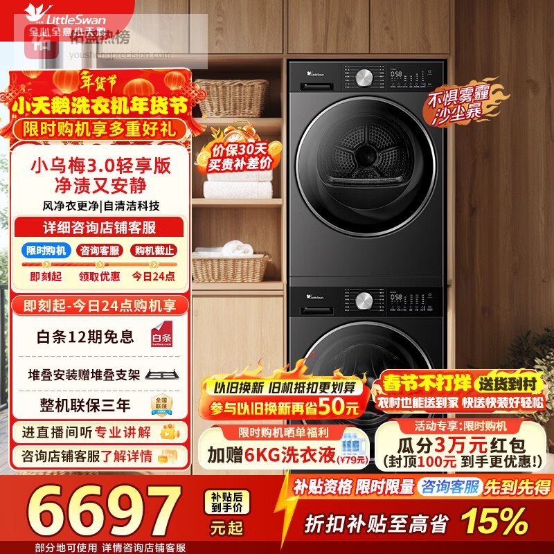 小乌梅3.0轻享版洗烘套装 10公斤滚筒全自动家用洗衣机+变频热泵烘干机 纯平全嵌AI智投 TG10VE10+TH10VE10¥