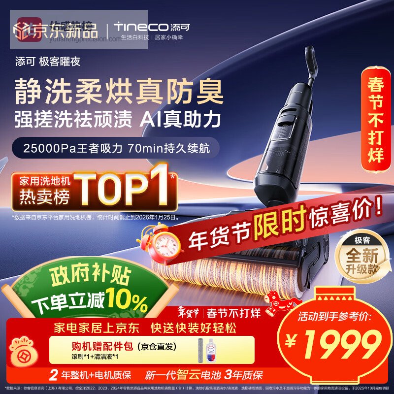 【京东自营】添可极客曜夜【AI真助力25Kpa暴风吸】祛顽渍防臭0缠毛躺平洗地机吸拖一体自动清洗扫地¥