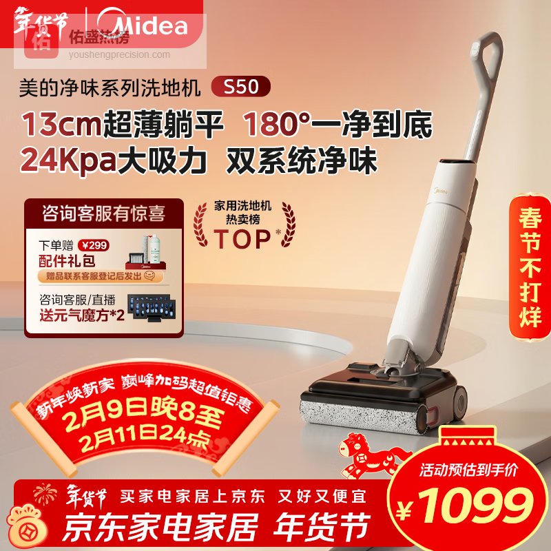 【京东自营】美的洗地机S50洗拖吸一体自动清洗【24Kpa大吸力超薄平躺全自动清洁】家用吸尘扫地拖地¥