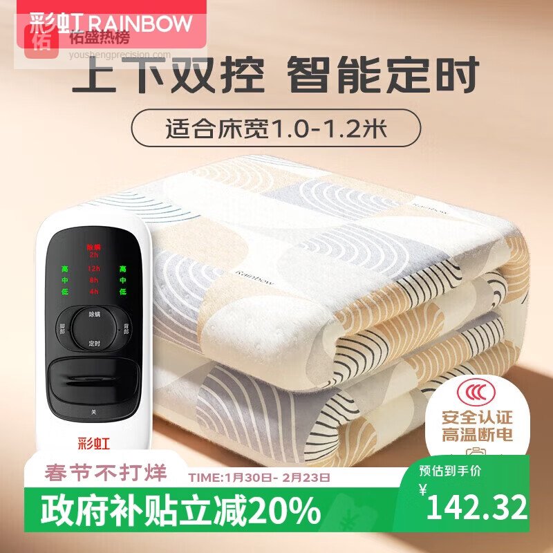 彩虹【高温断电】单人上下双控定时除螨无纺布电热毯电褥子1.8*1.0米¥