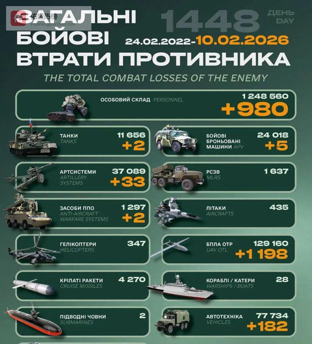 截至战争第1448天,乌方统计俄军累计伤亡124.86万人,过去24小时新增980人。