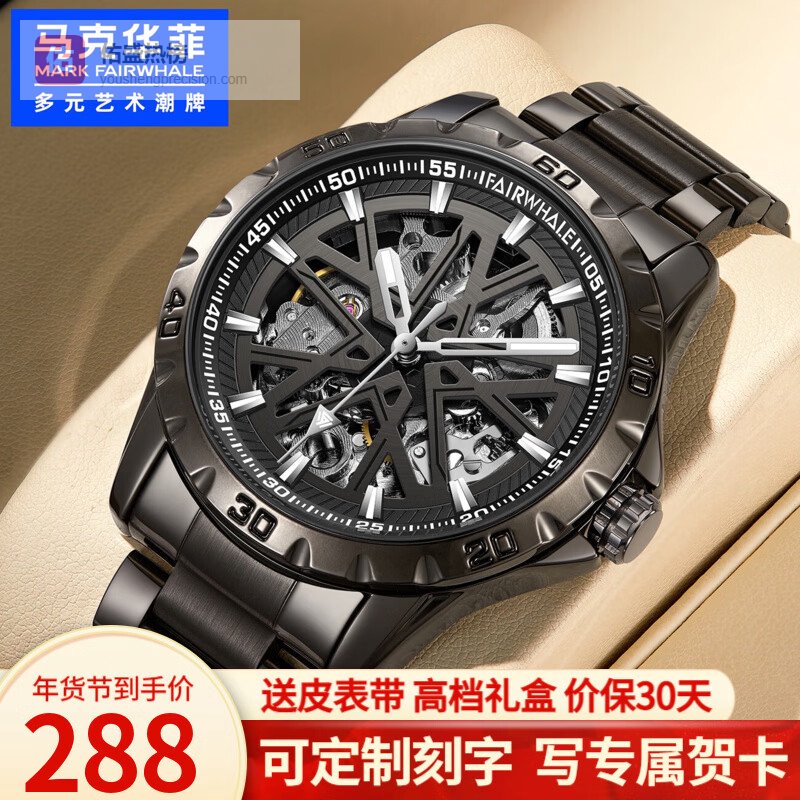 【明星代言】马克华菲手表国潮机械表 全自动防水手表男士时尚镂空运动男表 瑞士风品质夜光潮流个性腕表 全黑黑面钢带¥