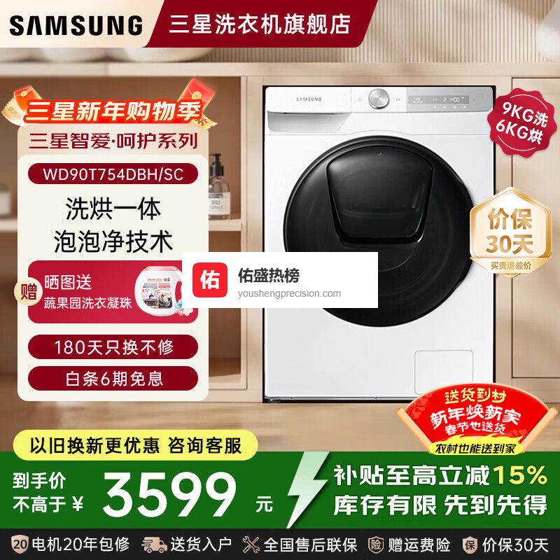 【品牌直营】三星【智爱·呵护系列】全自动滚筒洗衣机洗烘一体机WD90T754DBH/SC9kg洗6k¥