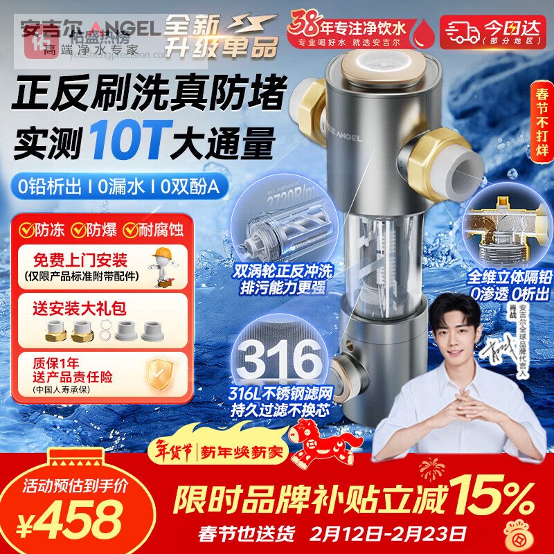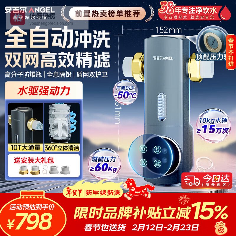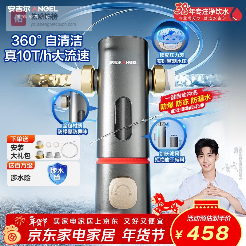 【京东自营】安吉尔前置过滤器家用自动反冲洗防爆40微米双网精滤10T大通量全屋入户自来水净水器J36¥