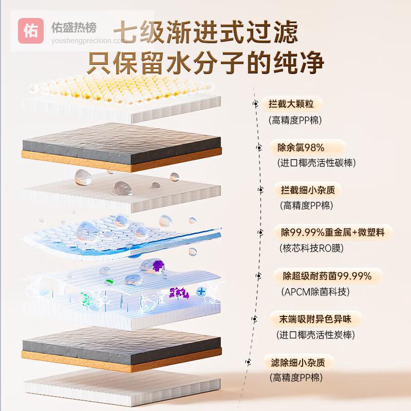 4️⃣七级过滤保障:通过七级渐进式过滤,有效阻挡新型污染物的侵入,同时保证水分子纯净。该技术为用户提供绝佳饮水口感,确保饮用水不仅安全,还能保持清新的味道,真正实现健康与美味兼得。
