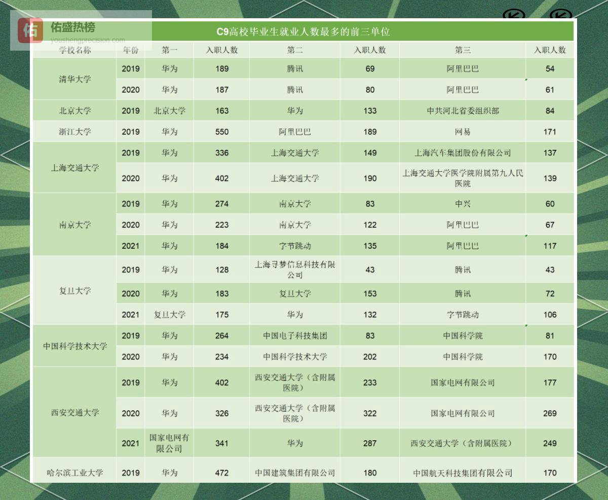 把目光对准具体单位,华为连续三年稳坐C9收割机宝座,仅近三年就录用4900余人;不过整体数量略有下滑,反观阿里、腾讯增长明显。另一边,留任本校(含附属医院)成为越来越多毕业生的“安全垫”,中科大毕业生扎堆中科院,西安交大则倾向国家电网。数字只是参考,真正的职业赛道仍由个人拍板——有人冲进大厂,也有人扎进黄土高坡;有人保研本校,也有人远赴海外。C9的标签只是起点,而非终点。