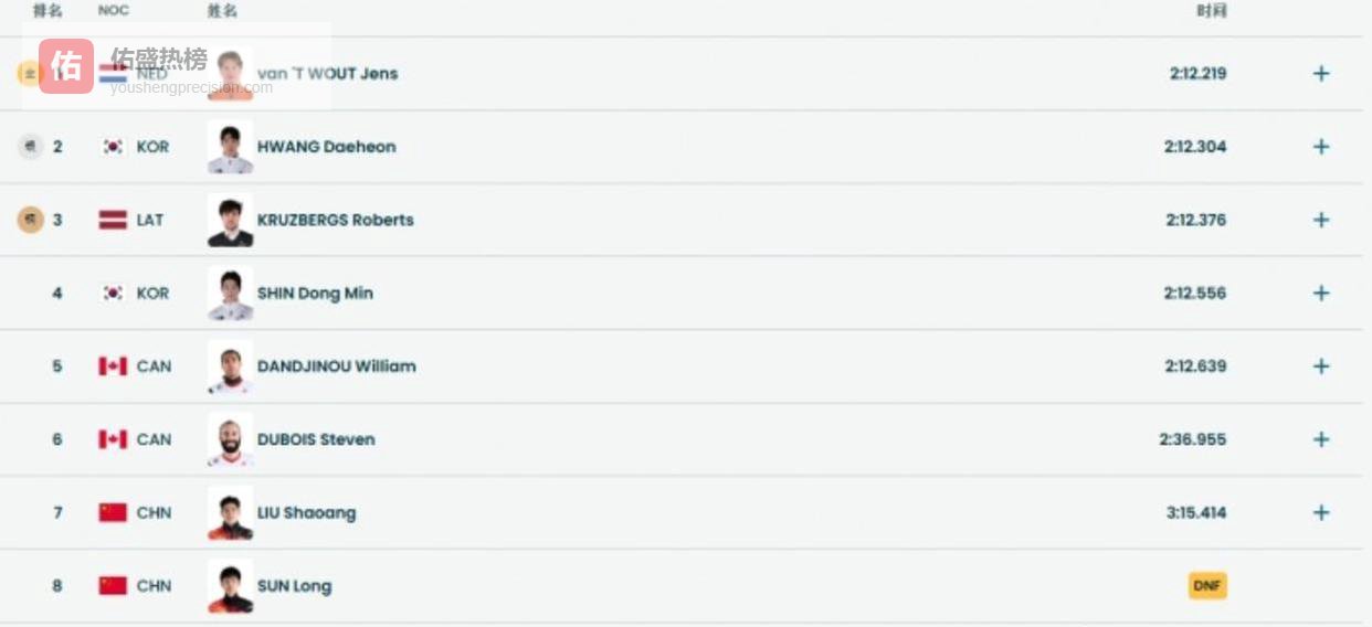 意外摔倒失奖牌决赛一开始,孙龙和刘少昂都处于落后的位置。但没想到的是,两人同时被干扰,结果双双摔倒,遗憾失去了争夺奖牌的机会。最终,荷兰选手范特沃特以2分12秒21的成绩拿到了金牌,韩国选手黄大宪获得银牌,而拉脱维亚的克鲁兹博格则摘得铜牌。