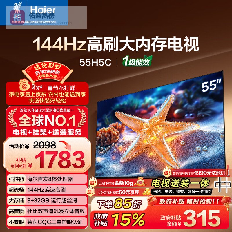 海尔(Haier)电视 包安装版【固定挂架送装一体】55H5C 55英寸4K超高清144Hz高刷高色域3+32GB游戏智能一级能效¥