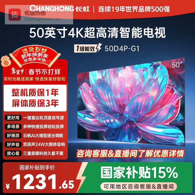 七、长虹▶ 4K超清大屏:这款长虹50D4P-G1电视配备超高清4K分辨率,让画面更加细腻清晰,无论看电影还是玩游戏,都能享受到极致的视觉体验。