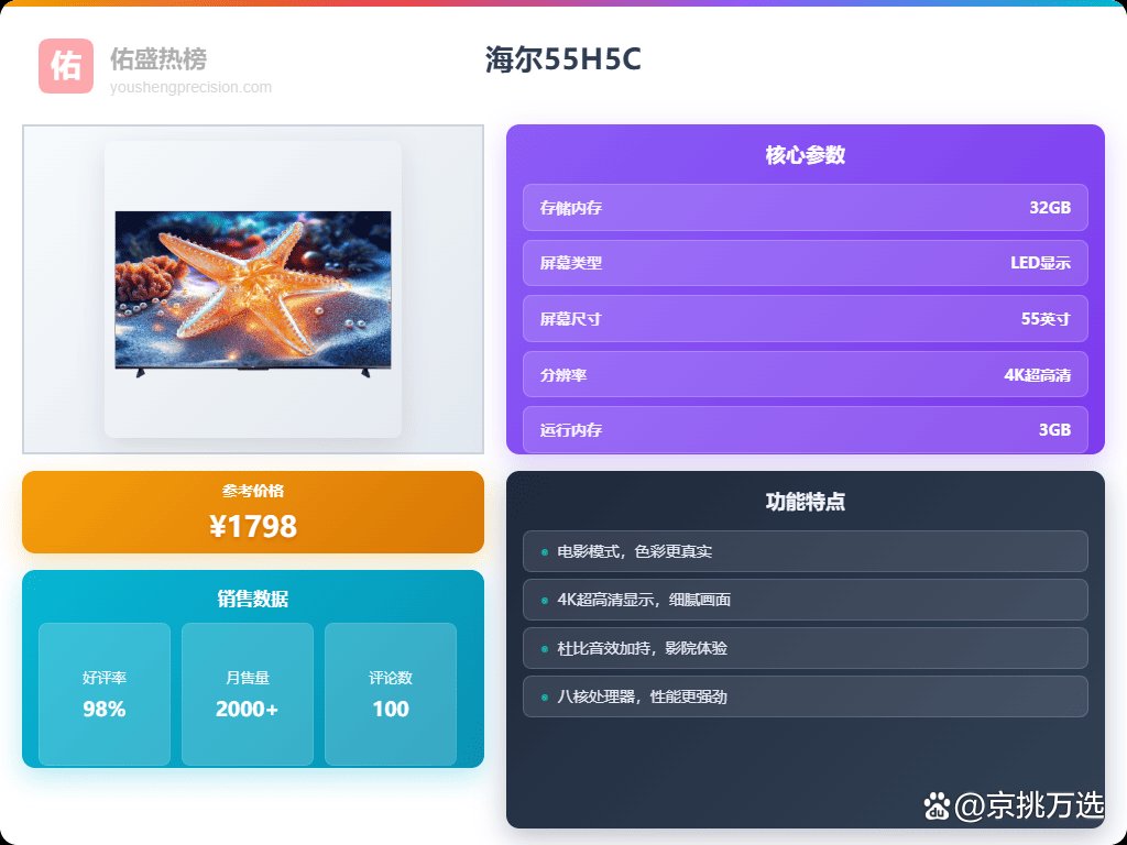 四、海尔▶ 4K超高清屏幕:这款海尔55H5C配备了超清4K分辨率,画面细节非常丰富,色彩也更加鲜活。不论是看电影、追剧还是玩游戏,都能享受到清晰细腻的画质,视觉体验变得更加真实自然。