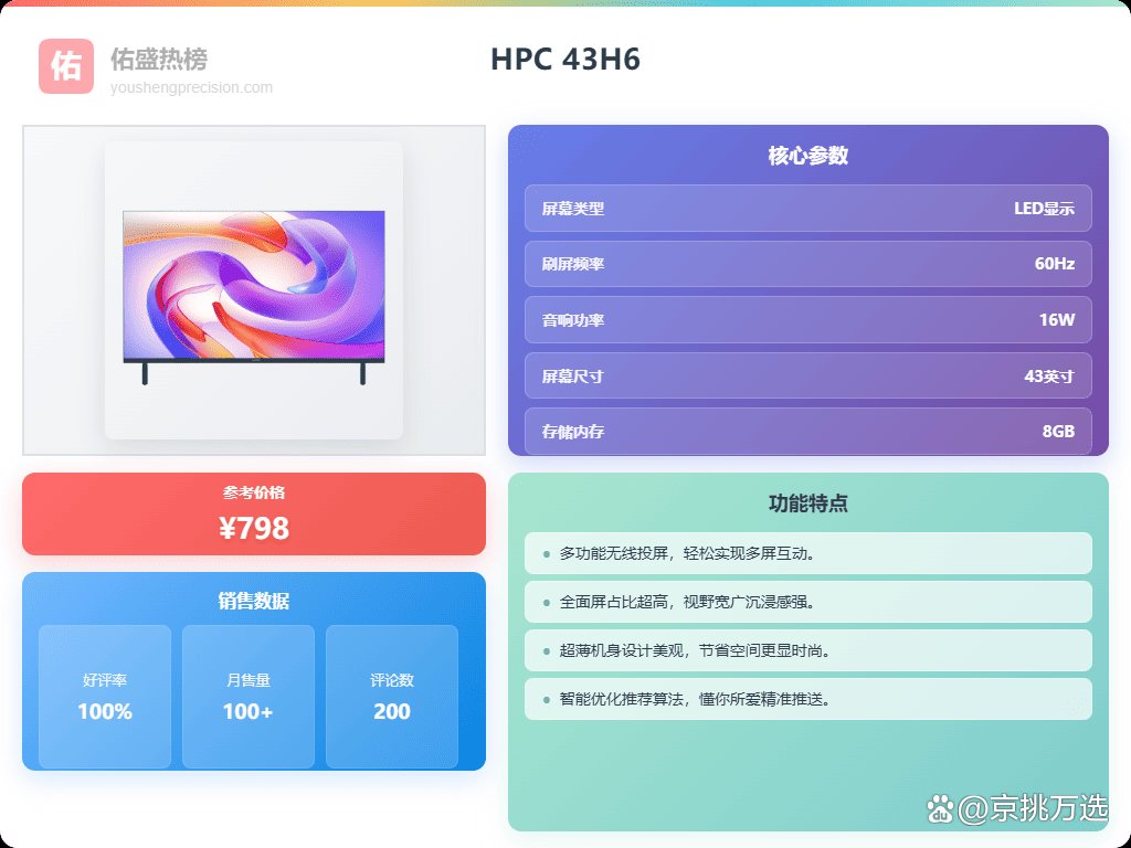 十、HPC▶ 高清画质:这款HPC 43H6电视配备了高清分辨率,画面呈现得特别清晰明亮,细节丰富、色彩自然,让你仿佛身临其境地享受每一幕精彩场景。无论是看电影、追剧还是玩游戏,都能带来视觉上的极致体验。