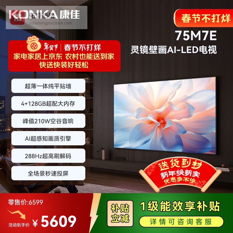 康佳电视 75M7E 75英寸 288Hz高刷 纯平贴合壁纸系列 一级能效 智能电视会议电视¥