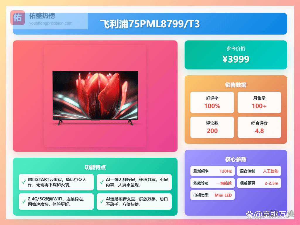 九、飞利浦▶ 高清画质:这款飞利浦75寸电视采用MiniLED背光技术,能实现更高的对比度和亮度,细节更清楚,画面更鲜明。配合QLED纳米量子点技术,色彩表现更饱满、真实,看电影、追剧都特别过瘾。120Hz高刷新率,画面流畅不卡顿,动物、运动场面特别自然,基本不会拖影或撕裂。