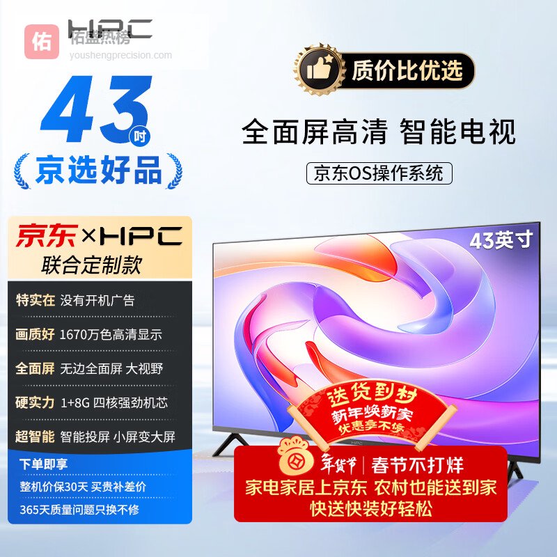 HPC京东联名 43英寸 8G大内存 超薄智慧全面屏 高清智能网络 教育平板游戏液晶电视机 以旧换新 43H6¥