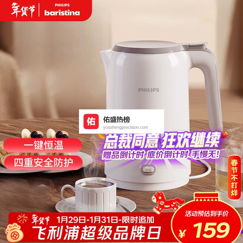 飞利浦(PHILIPS)恒温电水壶 家用大功率热水壶 一键保温 304不锈钢1.5L HD9366 新年礼物¥