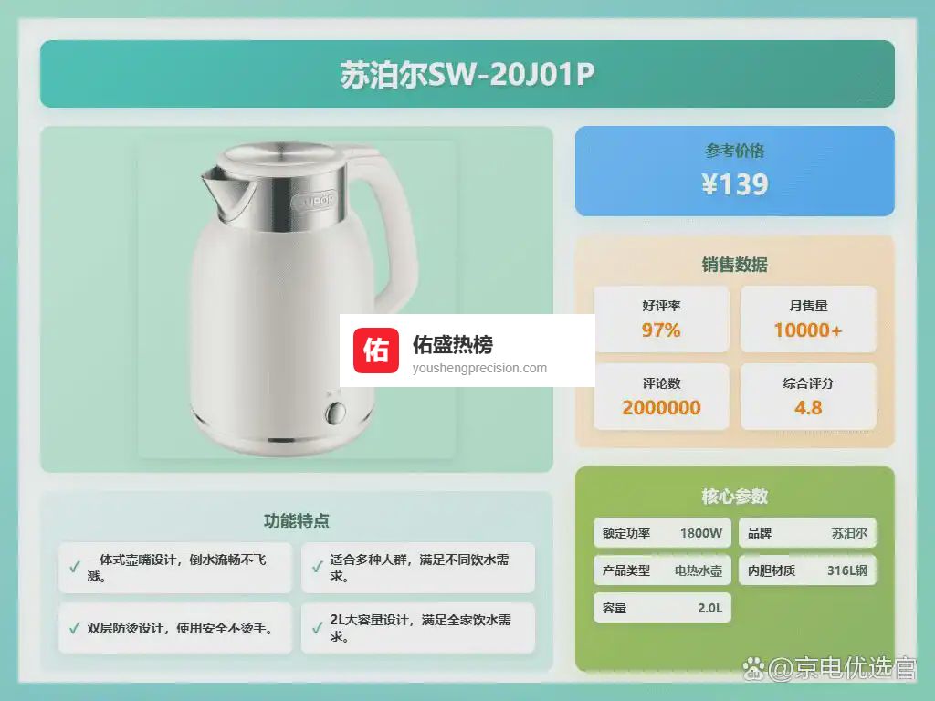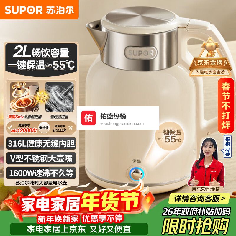 二、苏泊尔这款苏泊尔SW-20J01P电热水壶的最大亮点在于大容量和保温功能。它配备了1.6到2升的容量,基本可以满足家庭或办公室的多人饮水需求,烧水速度也较快,1800W的功率让水很快就能沸腾。而且,内胆采用316L不锈钢,安全健康,耐腐蚀,不会影响水质。除了快速加热,它还支持一键恒温保温,水温能长时间保持在理想范围,喝热水省心又方便。