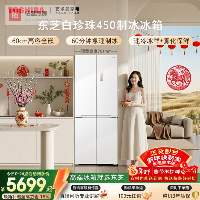 1. 东芝(TOSHIBA)白珍珠429L十字门冰箱450自动制冰60cm超薄零嵌入式家用一级能效GR-RF450WI-PM151国家补贴