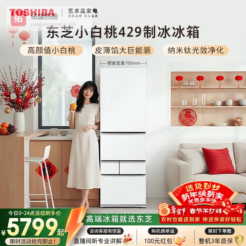 东芝(TOSHIBA)小白桃409L五门日式多门冰箱429嵌入式自动制冰玻璃面板小户型GR-RM429WE-PG2B3¥