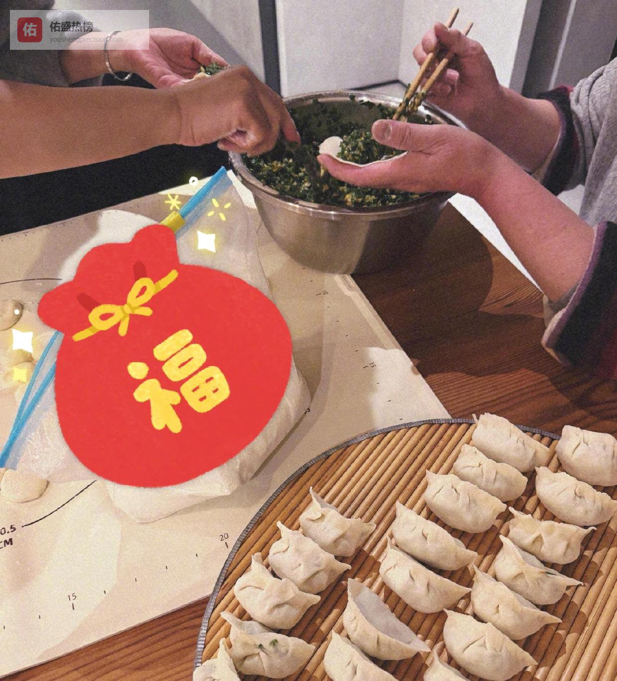 这顿年夜饭最终摆了十二道菜上桌,有洋葱肥牛、手工水饺、清蒸鱼、辣子鸡、扣肉等等。 主食是饺子,看起来像韭菜馅,用老式饺子垫码着,餐后甜点是汤圆,夫妻俩还凑一起研究汤圆里面是什么馅儿。 所有菜色都是家常菜,没有一道称得上奢华,但满满一桌子热气腾腾,看着就踏实。