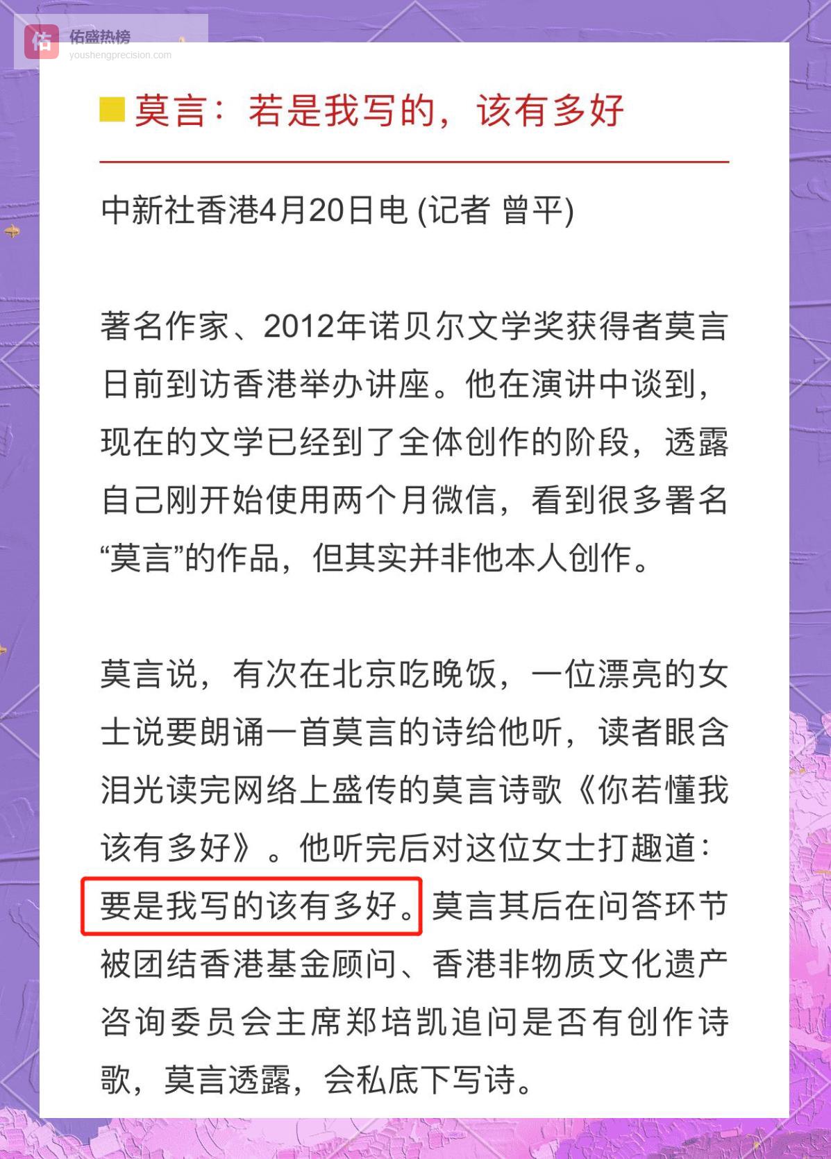 “以上都不是我说的。”短短一句,配上标志性的“告辞”表情包,莫言在公众号扔出重磅“澄清帖”。《莫言:这些作品真不是我写的》迅速刷屏,文章里他一口气点名《你若懂我该有多好》《莫言说》《我》等十余条“署名作品”,并郑重声明:它们或诗词、或金句,全与自己无关。