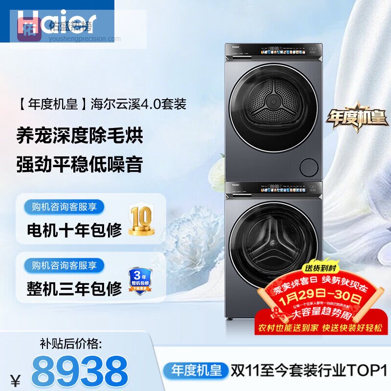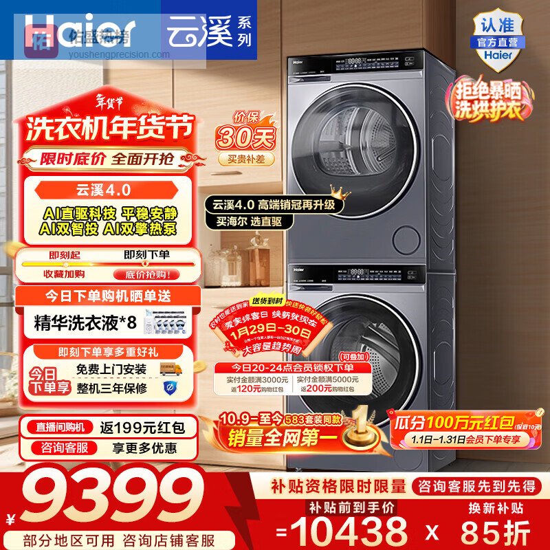 【京东自营】海尔年度机皇云溪4.0滚筒洗烘套装10KG洗衣机+双擎热泵烘干机家电补贴自营583+58¥