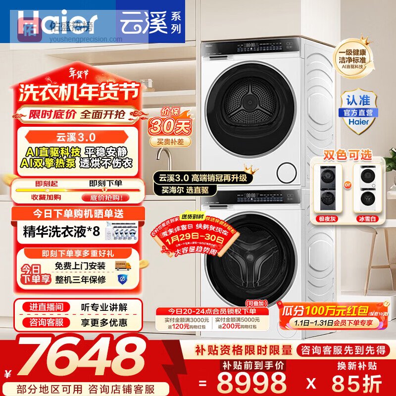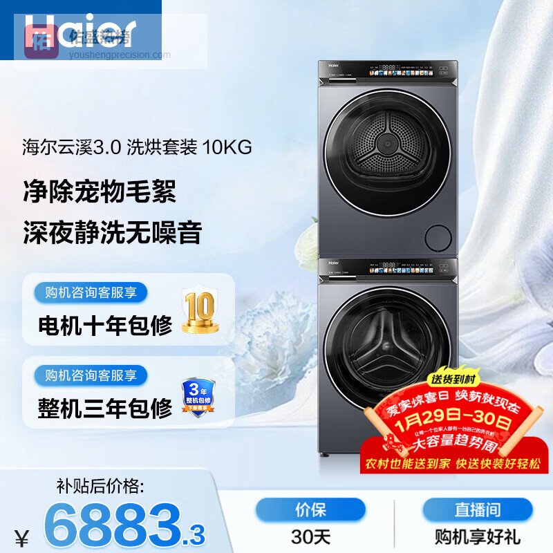 【京东自营】海尔云溪3.0滚筒洗烘套装10KG全自动洗衣机+热泵烘干机家用家电补贴京东自营583+5¥